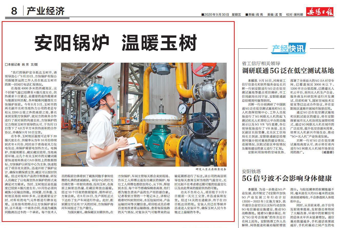 近日,安陽日報就方快鍋爐進(jìn)駐藏區(qū)—青海玉樹供暖項(xiàng)目做了專題報道:《安陽鍋爐,溫暖玉樹》。