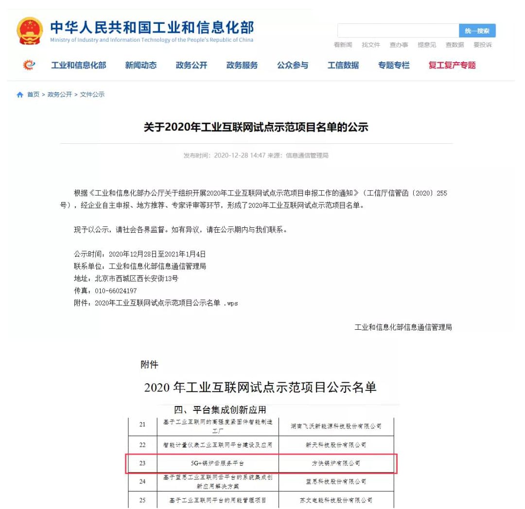 12月28日,由國(guó)家工信部公示了2020年工業(yè)互聯(lián)網(wǎng)試點(diǎn)示范項(xiàng)目名單。方快鍋爐有限公司申報(bào)的“5G+鍋爐云服務(wù)平臺(tái)項(xiàng)目”憑借過(guò)硬的技術(shù)平臺(tái)和超前的行業(yè)運(yùn)作模式成功入圍。