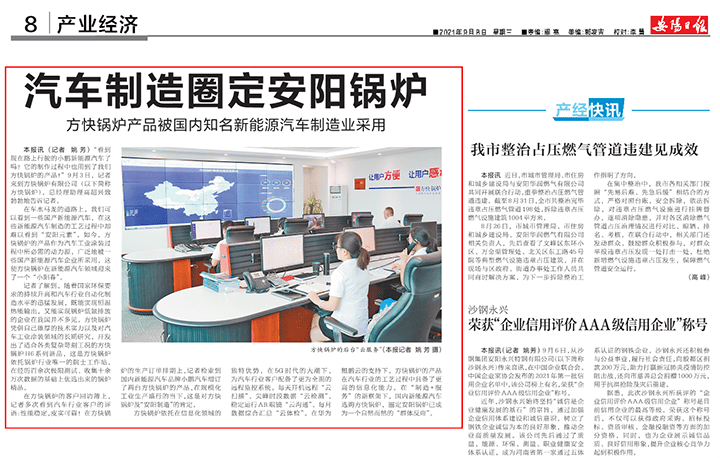 “看到現在路上跑的‘小鵬’新能源汽車了嗎?它的制作過程中也用到了我們方快鍋爐的產品!”9月3日,記者來到方快鍋爐有限公司(以下簡稱放快鍋爐),總經理助理高超興致勃勃地告訴記者。