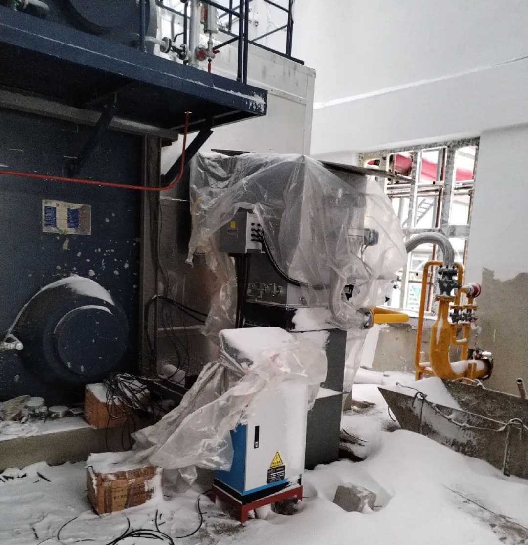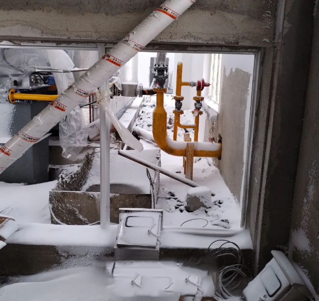 項目地全天持續下雪,由于沒有房頂和門窗,各施工環節都受到影響。整個鍋爐房已被積雪覆蓋并上凍,尹工現場指導安裝公司工人放線,并進行控制箱整改。